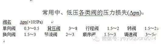 ΣΔp 包括油液流經(jīng)流量閥和其他元件的局部壓力損失、管路沿程損失等,在系統(tǒng)管路未設(shè)計(jì)之前,可根據(jù)同類系統(tǒng)經(jīng)驗(yàn)估計(jì),一般管路簡(jiǎn)單的節(jié)流閥調(diào)速系統(tǒng)ΣΔp為 (2~5)×105Pa,用調(diào)速閥及管路復(fù)雜的系統(tǒng)ΣΔp為(5~15)×105Pa,ΣΔp也可只考慮流經(jīng)各控制閥的壓力損失,而將管路系統(tǒng)的沿程損失忽略不計(jì),各閥的額定壓力損失可從液壓元件手冊(cè)或產(chǎn)品樣本中查找,也可參照下表選取。