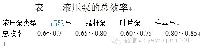 式中:pB為液壓泵的最大工作壓力(N/m2);qB為液壓泵的流量(m3/s);ηB為液壓泵的總效率,各種形式液壓泵的總效率可參考下表估取,液壓泵規(guī)格大,取大值,反之取小值,定量泵取大值,變量泵取小值。