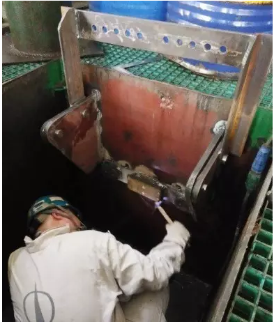 車間設計制作了一套液壓油缸固定專用工裝安裝于鉗工作業區的地坑內。不用時,鉸接機構打開,工具旋轉放入地坑內,并蓋上格柵。使用時,將地坑的格柵打開,上部固定槽鋼從下面翻到上面,將液壓油缸吊入地坑內,液壓油缸耳環插入固定耳板中,耳環孔內插入銷子,將上部固定槽鋼和下部固定槽鋼同時用螺栓收緊。底部同時有一層摩擦材料,通過槽鋼、摩擦材料及下部耳孔的銷子共同固定,使得液壓油缸既不會擺動,也不能轉動,以方便液壓油缸螺母的拆松和液壓密封件的更換。
