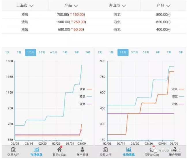 至3月9日,上海液氧價格3月內漲150元/T至750元/T,液氬至1500元/T,液氮680元/T;江蘇外銷市場同樣整體上揚,液氧升至780元/T,液氬1000元/T,液氮620元/T;山東液氧、液氬和液氮價格分別提高為600元/T、950元/T和580元/T;華北液氧則跳升至800元/T,液氬價格到850元/T。