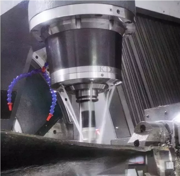 如圖,五軸機床可以采用刀具側刃切削,加工效率更高。