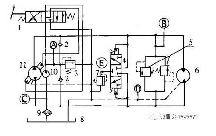 1-手動變量操作機構;2-單向閥;3-中位補油壓力安全閥;4-梭動閥;5-系統壓力安全閥;6-馬達;7-背壓閥;8-油箱;9-進油濾清器;10-補油泵;11-主泵