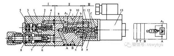 1-調速閥閥體,2-減壓閥;3-平衡閥;4,5-彈簧;6-節流閥套;7-節流閥芯,8-節流閥調節桿;9-主閥體; 10-錐閥;11-先導閥體;12-先導閥;13-直流濕式電磁鐵;a,b,c,d,e,f-腔