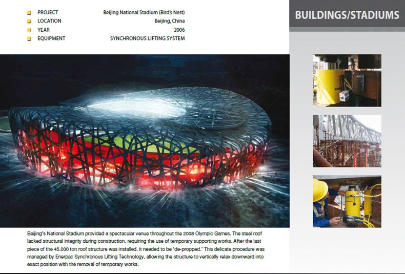 恩派克為北京“鳥巢”鋼結(jié)構(gòu)卸載提供了整套計(jì)算機(jī)控制的多點(diǎn)同步卸載設(shè)備。整套設(shè)備由55套ENERPAC專用液壓泵站提供動(dòng)力源,由一個(gè)中央控制器和十個(gè)區(qū)域控制器對(duì)78個(gè)點(diǎn)(156個(gè)ENERPAC大噸位油缸)采集信號(hào)、發(fā)出指令完成鋼結(jié)構(gòu)的載荷的同步轉(zhuǎn)移。