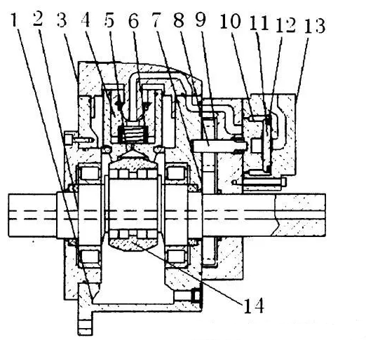 它包含殼體 1、曲軸 2、缸蓋 3、擺缸4、柱塞 5、柱塞復位彈簧 6、主動齒輪 7、雙頭鍵 8、從動齒輪 9、配流盤 10、輔助配流側板 11、波形彈簧 12 和配流殼體 13,曲軸 2 的中部通過曲軸支承套 14 套接有柱塞 5,柱塞 5 外側設置有柱塞復位彈簧 6,柱塞復位彈簧 6 外側設置有擺缸 4,擺缸 4 外設置有缸蓋 3,缸蓋 3 外部設置有殼體 1,柱塞 5 右端的曲軸 2 上固定套接有主動齒輪 7,主動齒輪 7 通過雙頭鍵 8、從動齒輪 9 與配流盤 10 相配合,配流盤 10 一側設置有輔助配流側板 11,輔助配流側板 11通過波形彈簧 12 與配流殼體 13 相配合。曲軸支承套 14 和曲軸 2 之間采用滾珠結構 ;這種滾珠結構將滑動摩擦轉化為滾動摩擦,可顯著降低摩擦發熱并提高液壓馬達的機械效率。 缸蓋 3 和擺缸 4 之間采用球鉸連接。球鉸連接可以完全消除擺缸 4 與柱塞 5 這對摩擦副之間的側向力,可提高馬達的機械效率并提高液壓馬達的啟動扭矩。同時,擺缸與缸蓋之間的球鉸設計也可使柱塞與曲軸支承套之間更好的貼合,減少該對摩擦副之間的泄漏,從而提高液壓馬達的容積效率。