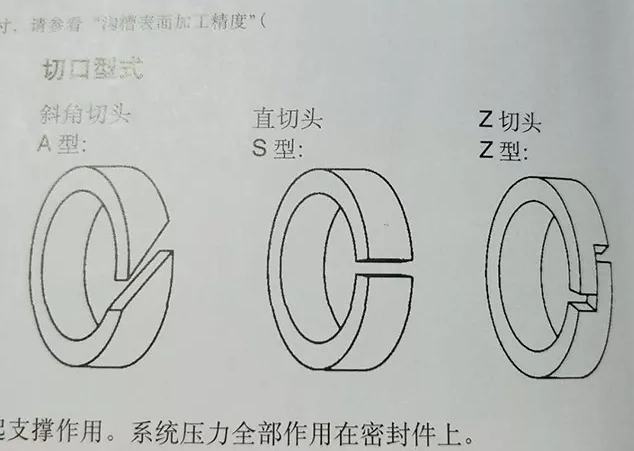 導向環的切口方式根據工作狀況不一有以下三種,A型斜切30°-用于往復運動;S型直切頭用于旋轉運動,Z型切頭一般用于特殊場合。切割長度:活塞用L=3.092X(D-W);活塞桿用 L=3.092X(d+W).D為活塞直徑,d為桿徑;W 為導向帶厚度。