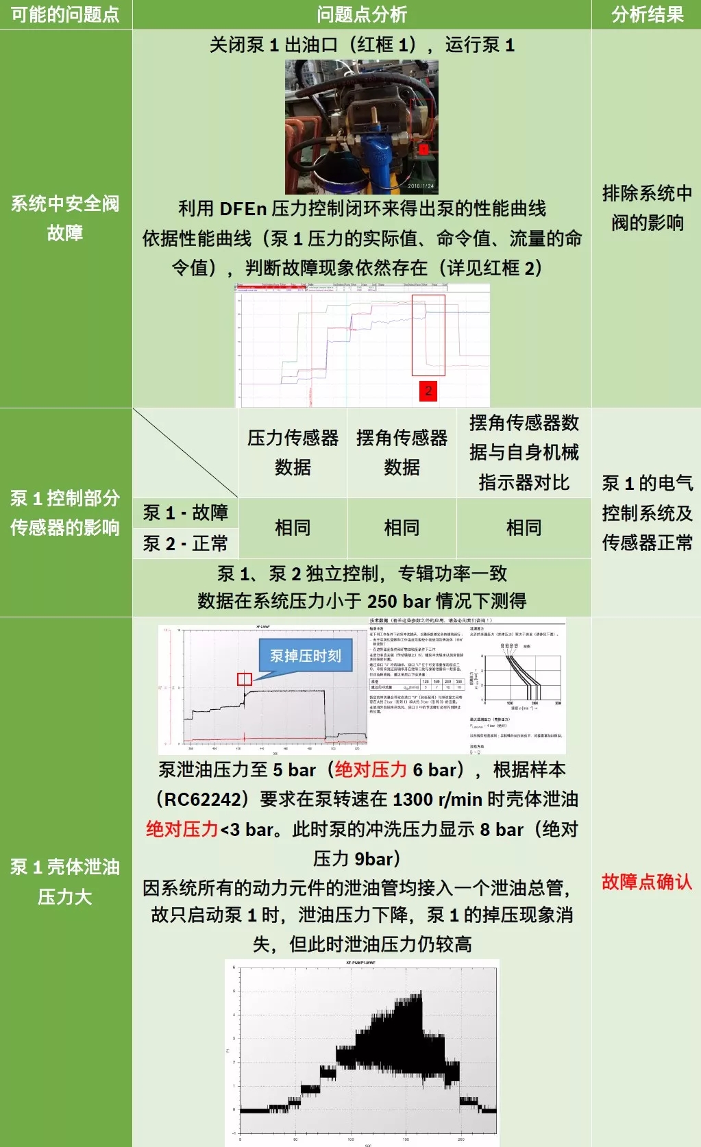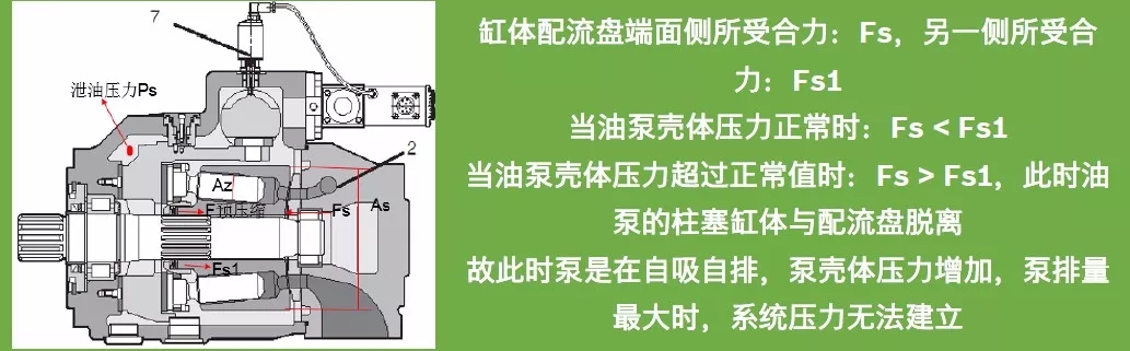 可以肯定泵1的掉壓現象是由于殼體壓力大導致。但掉壓時泵1的排量不降反升,我們不禁要問這么多流量的去處,以及泄油壓力為何還是偏高,可得原因如下: