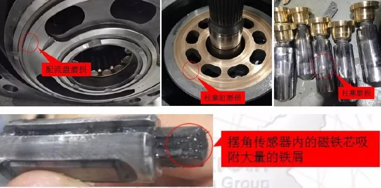 可以看出泵配流盤、缸體、柱塞已受到嚴重磨損,配流盤與缸體之間的面密封遭到了破壞,進而泄露油流量增加,配流盤與缸體更加容易脫離,進而加劇泵的磨損。